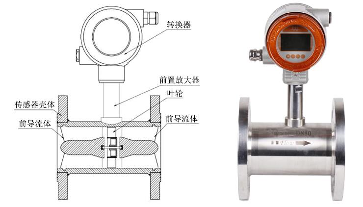 流體流經(jīng)傳感器殼體,由于葉輪的葉片與流向有一定的角度,流體的沖力使葉片具有轉(zhuǎn)動(dòng)力矩,克服摩擦力矩和流體阻力之后葉片旋轉(zhuǎn),在力矩平衡后轉(zhuǎn)速穩(wěn)定,在一定的條件下,轉(zhuǎn)速與流速成正比,由于葉片有導(dǎo)磁性,它處于信號(hào)檢測(cè)器(由**磁鋼和線圈組成)的磁場(chǎng)中,旋轉(zhuǎn)的葉片切割磁力線,周期性的改變著線圈的磁通量,從而使線圈兩端感應(yīng)出電脈沖信號(hào),此信號(hào)經(jīng)過(guò)放大器的放大整形,形成有一定幅度的連續(xù)的矩形脈沖波,可遠(yuǎn)傳至顯示儀表,顯示出流體的瞬時(shí)流量或總量。在一定的流量范圍內(nèi),脈沖頻率f與流經(jīng)傳感器的流體的瞬時(shí)流量Q成正比,流量方程為: