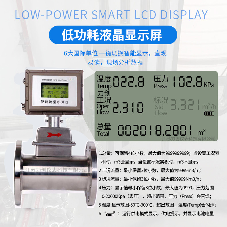 氣體渦輪流量計(jì)為了使用方便,電池供電的就地顯示型氣體渦輪流量計(jì)采用微功耗****,采用鋰電池供電可不間斷運(yùn)行一年以上,節(jié)省了電纜和顯示儀表的采購安裝費(fèi)用,可就地顯示瞬時(shí)流量、累積流量等。溫度補(bǔ)償一體型渦街流量計(jì)還帶有溫度傳感器,可以直接測量出飽和蒸汽的溫度并計(jì)算出壓力,從而顯示飽和蒸汽的質(zhì)量流量。溫壓補(bǔ)償一體型帶有溫度、壓力傳感器,用于氣體流量測量可直接測量出氣體介質(zhì)的溫度和壓力,從而顯示氣體的標(biāo)況體積流量。